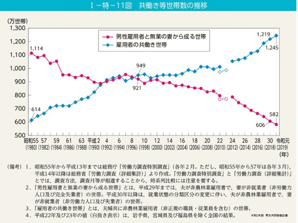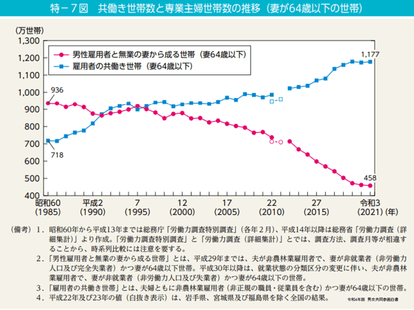 ご覧いただいている通り、ブルーの右肩上がりのラインが共働き世帯、ピンクの右肩下がりというのが男性の雇用者と無業の妻からなる世帯になり、いわゆる専業主婦世帯です。こう見ていただくと、非常に乖離(かいり)をし始めています。平成2年ぐらいからポイントが重なって、そこからどんどん開いています。