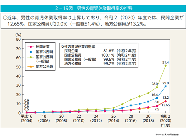 実は今、国家公務員は50%を超える勢いで取得率が非常に進んでいます。これはやはり「隗(かい)より始めよ」ということで、国を挙げて男性の育休取得率を進めていきましょうとなっています。こういうふうに見ていただきますと、民間企業はまだまだかなというふうにも見えるかもしれませんけれども、民間企業もここのところ変わり始めていて、国としては13.2%というこの数値をもっと上げていきたいと考えています。