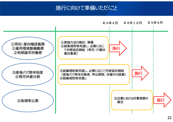 これはどういうことかと言いますと、まずは事業主から従業員に、「あなたは育休取れますよ」ということを適切にきちっと周知してください。そこで研修をしていったり、相談窓口を設けたり、さまざま事例を発表したりということをしていってください。まずこれがスタートラインですよと。