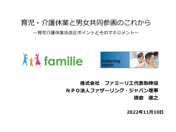 そこで今回、自身も大手日用雑貨メーカー勤務時代に育児休業を取得した、ファザーリング・ジャパン理事 徳倉康之氏(株式会社ファミーリエ代表)に、「育児介護休業法 改正ポイントをわかりやすく解説!マネジメントに求められる意識改革とは」というテーマでお話をいただきました。