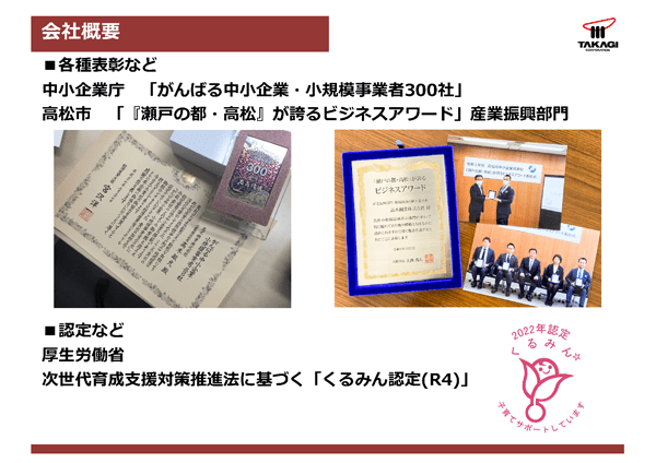 中小企業庁さんからは「がんばる中小企業・小規模事業者300社」、本社の所在する高松市さんからは「瀬戸の都・高松が誇るビジネスアワード」という賞も頂戴するなど、色々なことに取り組んでいることもご評価いただいております。