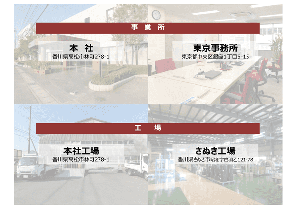 弊社は、本社が香川県高松市にあります。事業所としては東京に事務所が1件あります。また、工場は基本的に生産を国内でやっておりまして、本社工場とさぬき工場があります。市は違いますが、それぞれ香川県内に構えています。本社や工場の人材確保もこの地方特有の要因が関わってまいります。