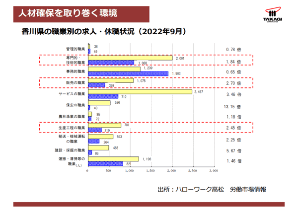 先ほど必要な人材についてお話をさせていただきましたが、この香川県内の職業別の求人および求職状況のデータを見ていきます。