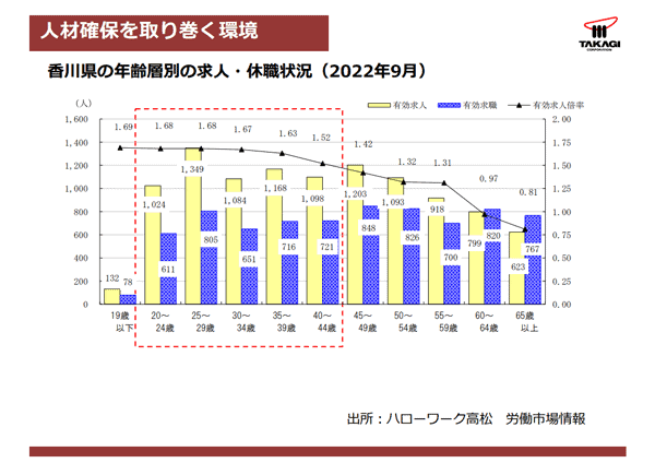 データから、香川県は全国平均以上の採用難の傾向にあります。また、弊社の求めている職種は、特に求職者が少なく、その中でも会社の現在から未来を作っていく年齢層が非常に少ない傾向にあります。