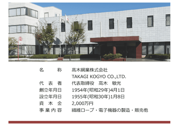 名前は髙木綱業株式会社です。この髙木綱業の綱は糸へんに岡で綱という漢字ということで、繊維ロープの製造を中心にさせていただいております。また、それに加えて電子機器の製造販売もしている会社でございます。今年で創立68年目で、あと2年で70年を迎えます。