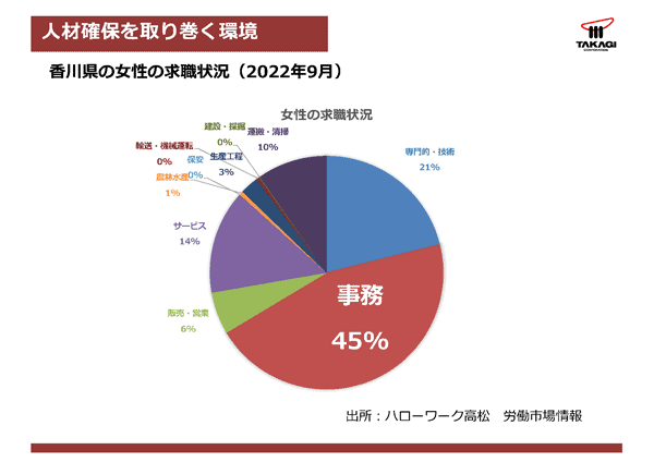 この円グラフで事務の職種が45%となっておりますけれども、色々ある職種の中で求職者の45%、ほぼ半数が事務職を希望しているといった地域の特性が出ています。