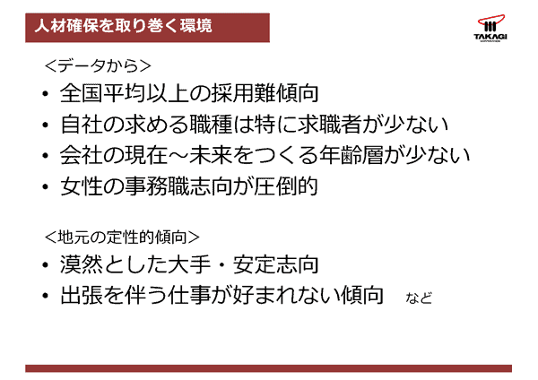 そして、女性活躍や女性活用です。女性の人材の登用を見ても、女性の事務職志向が圧倒的に強いといったところがあります。また、このデータ以外に地元の定性的な傾向を肌で感じていますが、新卒の学生さんにしても漠然とした大手安定志向が強いです。明確に「こういう仕事をしていきたい」といったキャリアに対するプランやビジョンを持っている求職者の方もあまり多くないのかなという感覚があります。