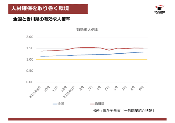 有効求人倍率が1を超えると採用難、1を切ると就職難という傾向です。こちらは、オレンジが1.00、青線が全国の数値です。全国的にも1は超えていますが、これは去年からの1年間ですが、香川県は、全国平均を上回る有効求人倍率で、全国平均以上に採用がしづらい状況になっているという形です。