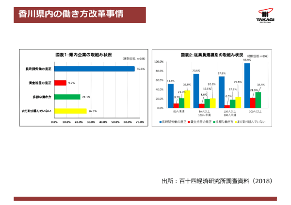 では、そういう背景を踏まえ、求人をどのように展開・開拓をしていこうかという中で、やはりセットになってくるのが、まずはより働きやすい環境を整備しようというところで、働き方改革に取り組まれている会社さんも県内に多数ございます。この香川県内の働き方改革事情もデータの方から見ていきたいと思います。