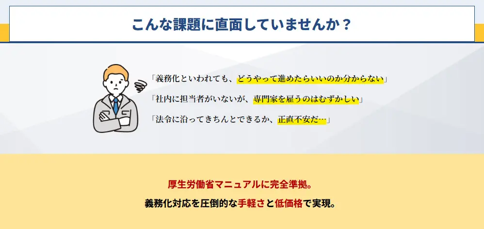 中小企業が実施する際に課題となる導入コストの高さ・煩雑な事務手続きや情報の管理・法令を満たす有資格者の確保を「届いて、記入し、返送するだけ」でクリアできる厚生労働省マニュアルに即したパッケージサービスです。