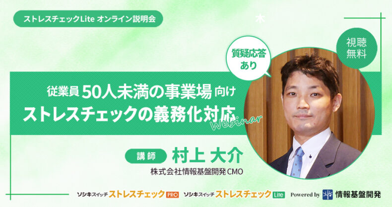 ストレスチェック制度開始時よりサービス提供してきた株式会社情報基盤開発は、法改正に伴う「ストレスチェック実施の全事業場義務化」準備に向けた、従業員50人未満の事業場・法人組織・団体を対象とするオンライン説明会を3月10日(火)・3月24日(火)に開催いたします。