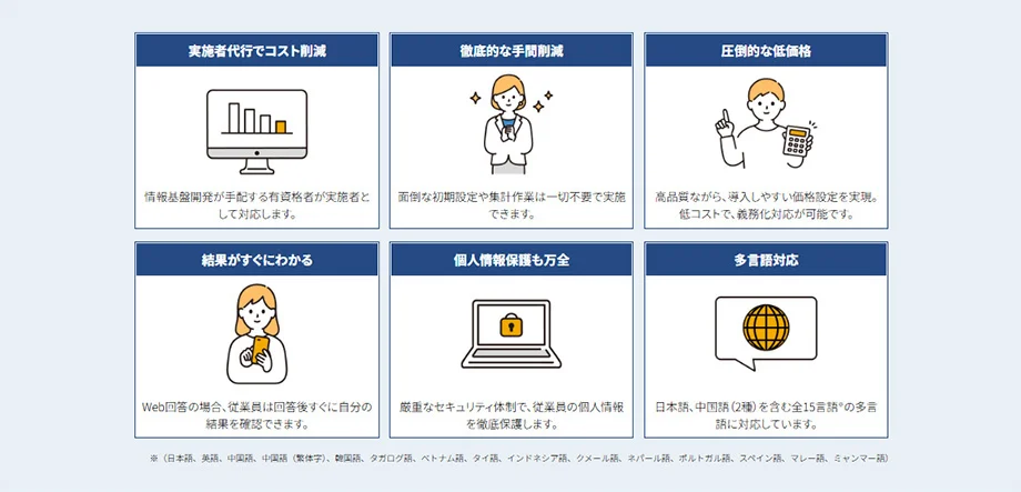 導入しやすい低価格設定ですが、結果を見やすくまとめた分析レポートや紙・WEBが選べる受検システム、製造・建築の現場で好評な15言語※1 の多言語対応、有資格者による実施者代行などストレスチェックに欠かすことができないサービスを標準搭載しています。