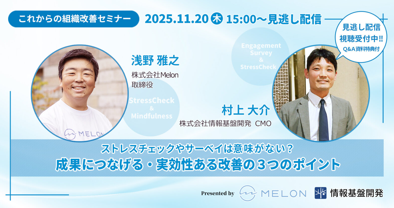 2025年10月9日(木)に開催した、株式会社情報基盤開発と株式会社Melon共催のオンラインセミナー「ストレスチェック・サーベイは意味がない?成果につなげる…